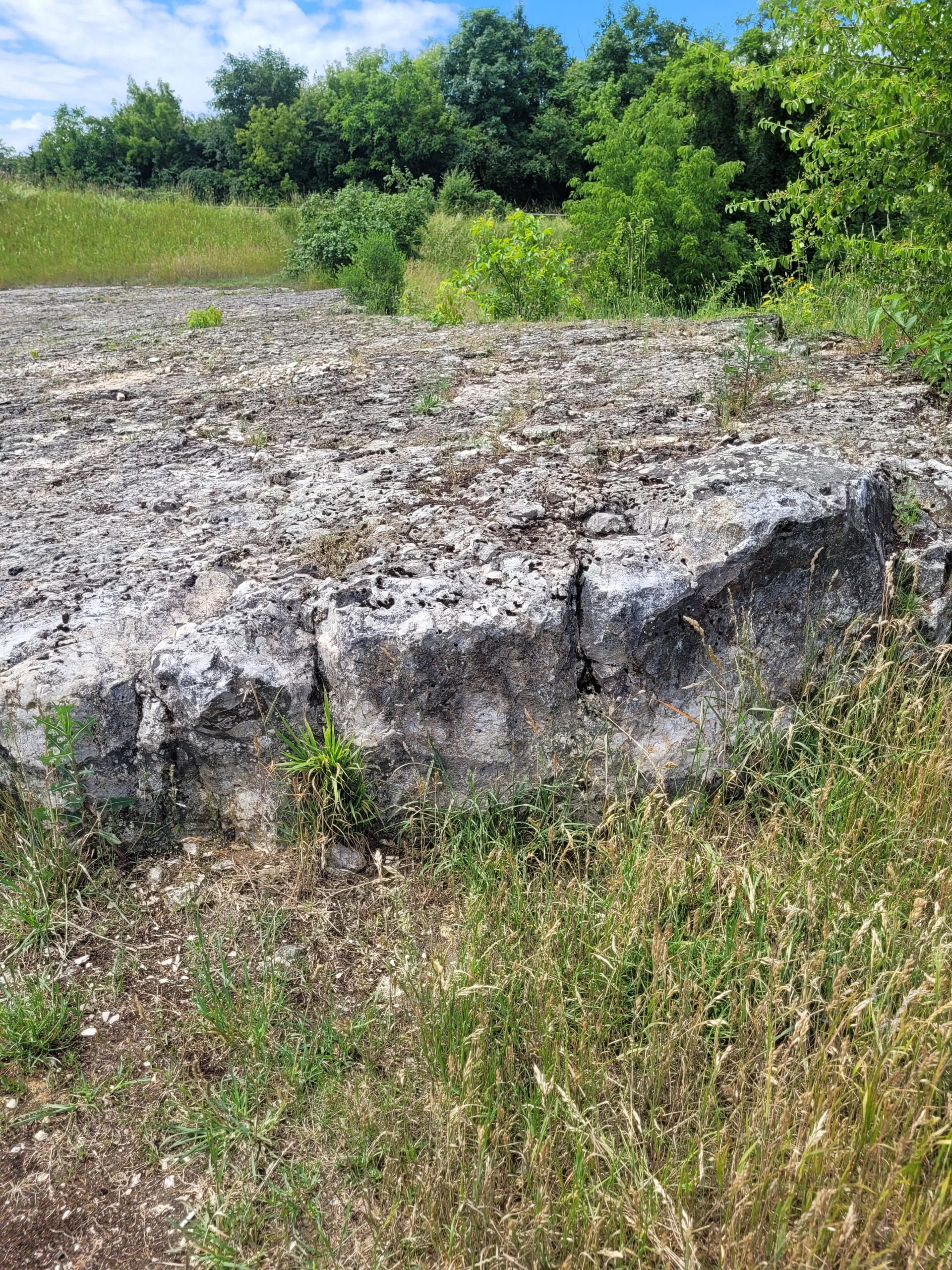 Od razu przy wejściu do kamieniołomu (jego południowej i największej części) przed odwiedzającymi rozpościera się długa ściana skalna o wysokości około 10 m. W jej obrębie występują dwie facje wapieni: uławicone (dolna część) oraz skaliste (górna część). Część uławicona zbudowana jest z wapieni z bardzo licznymi konkrecjami krzemionkowymi o barwie brązowo-szarej. Nad nią występuje wapień skalisty (nieuławicony) bez krzemieni, za to zawierający skamieniałości. Strop wapieni jurajskich stanowi powierzchnia abrazyjna, na której zalegają rozsypliwe kredowe (turońskie) wapienie, barwy żółtej. One także zawierają skamieniałości (małże i serpule) oraz klastyczny materiał terygeniczny (ziarna kwarcu).